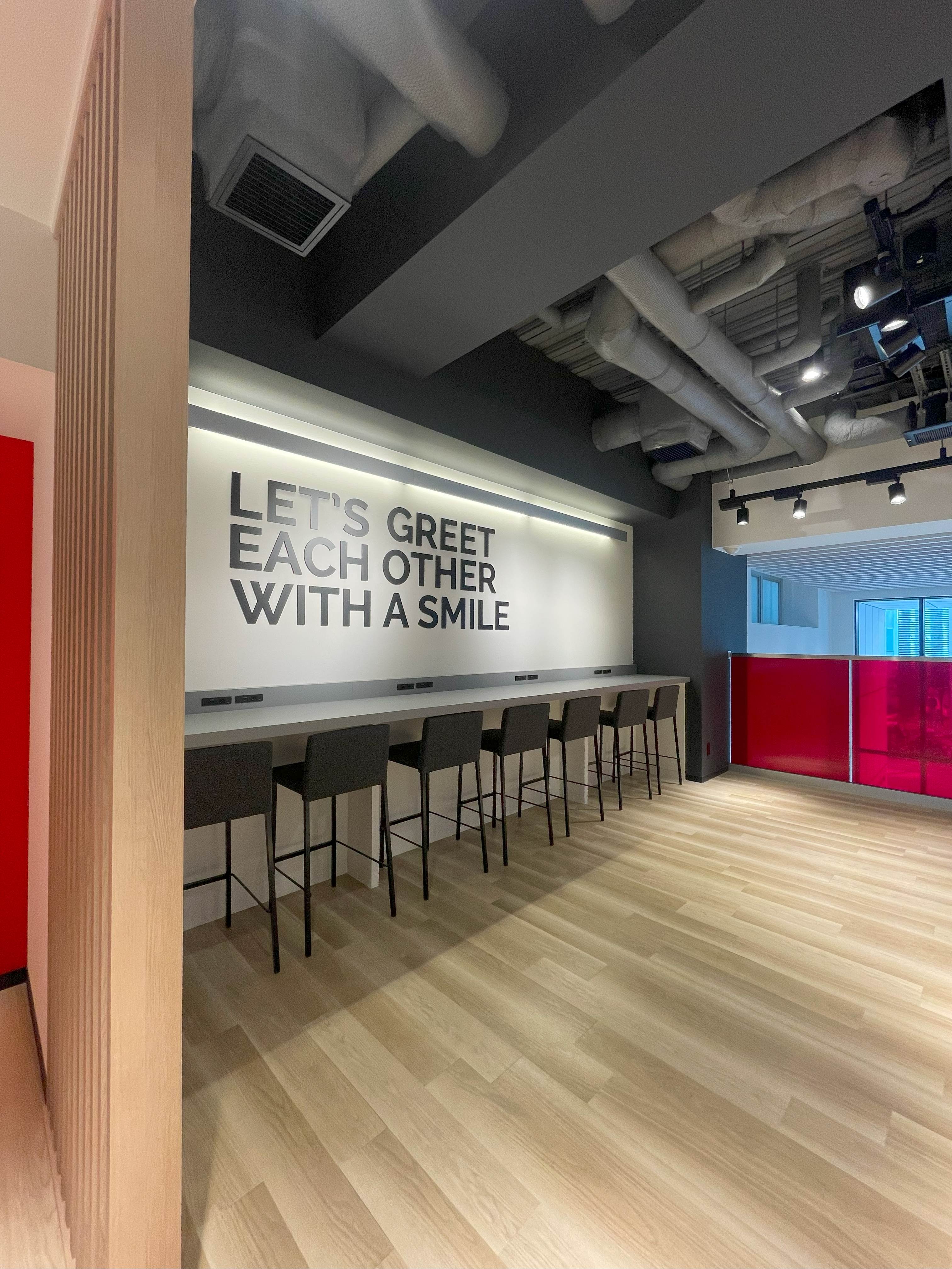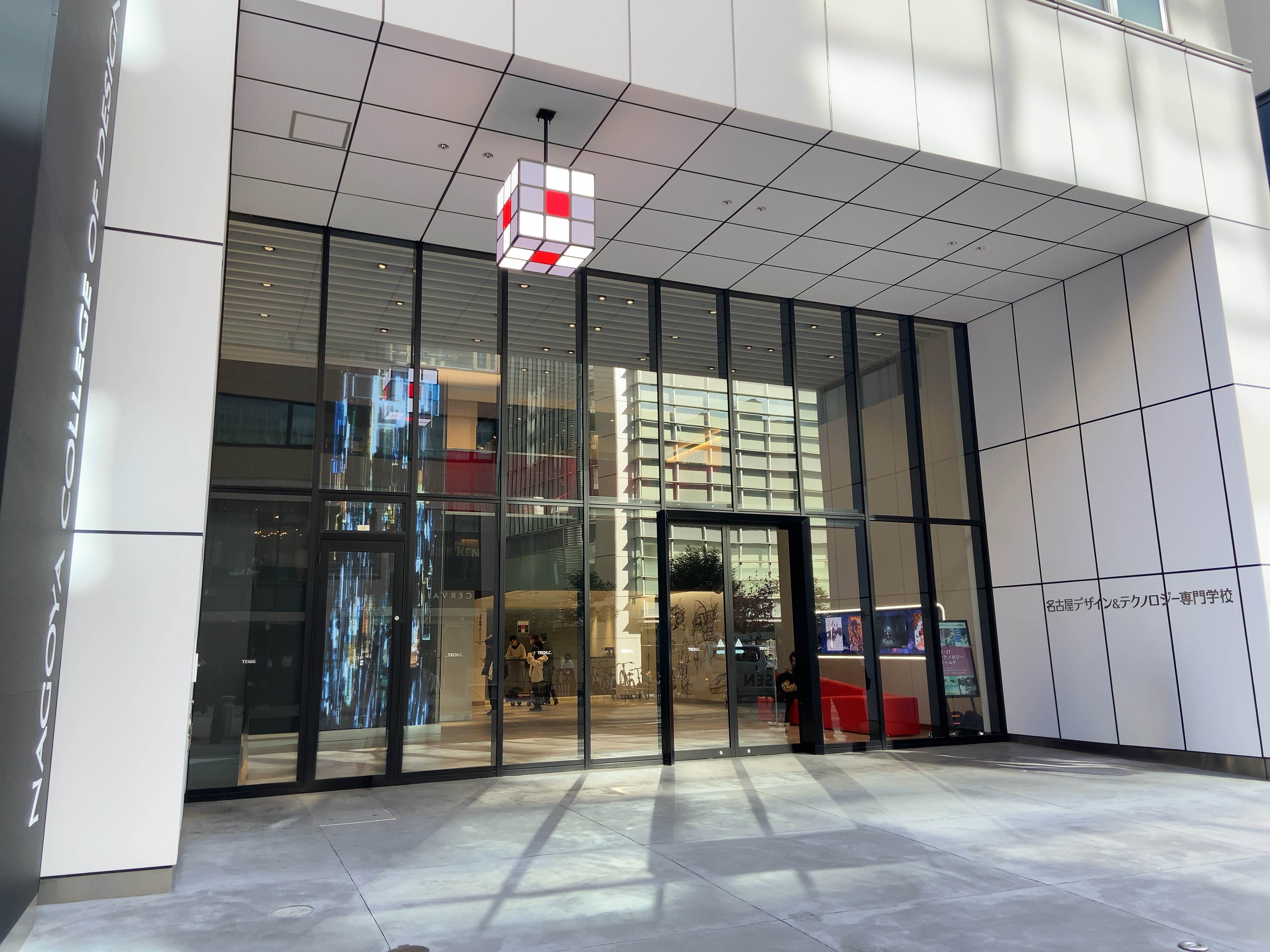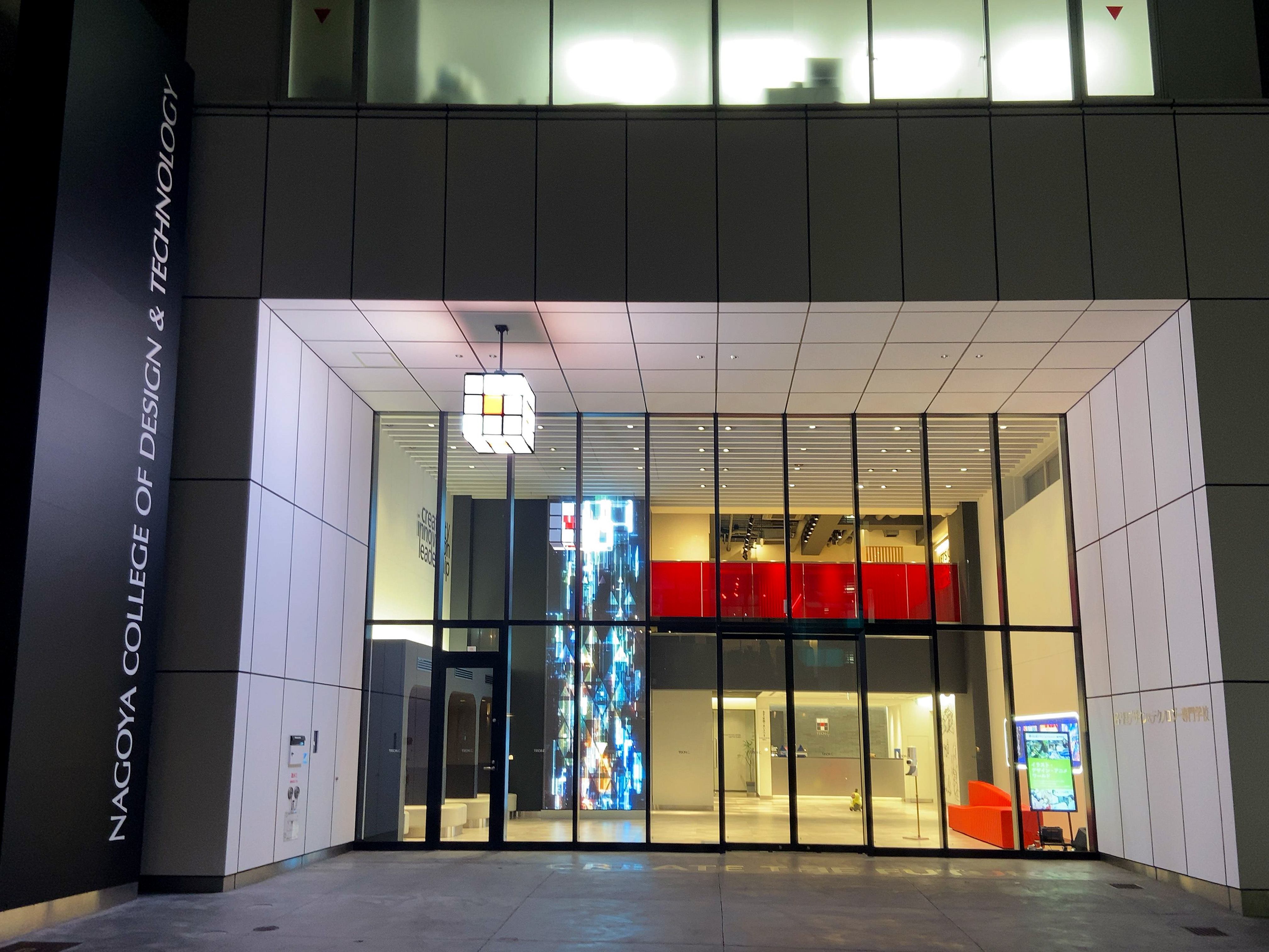 The renovation project of Nagoya College of Design and Technology is now complete. The facade, inspired by the school’s iconic cubic logo colors, has been transformed into a refreshing design that embodies a new era. At the entrance, a full-height LED mesh panel and an illuminated cubic logo welcome visitors.