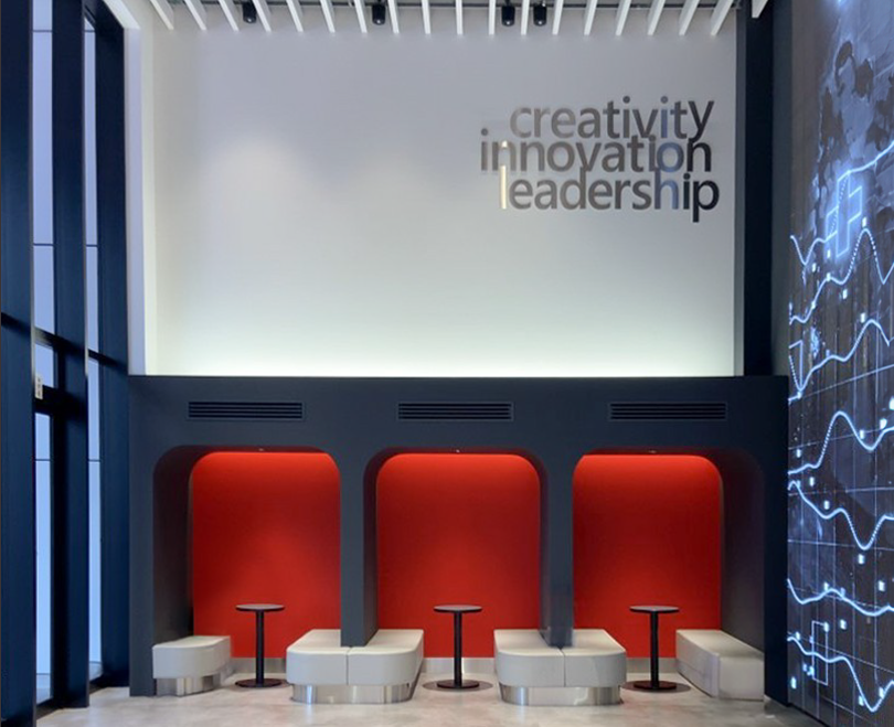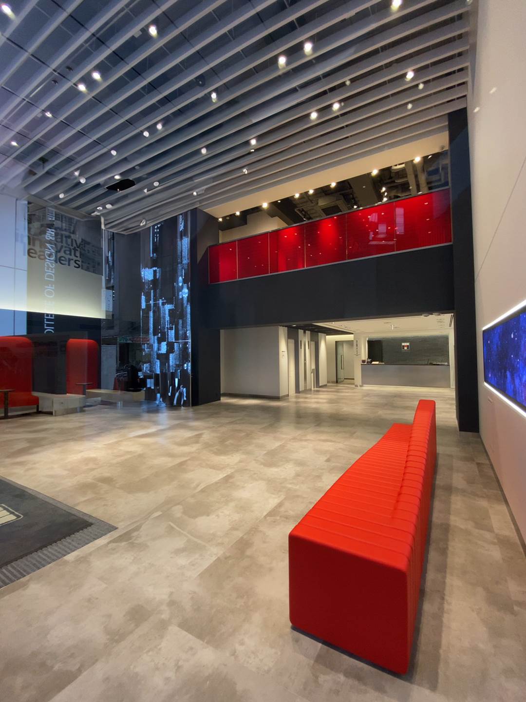 名古屋デザイン&テクノロジー専門学校の改修プロジェクトです。学校の象徴であるキュービックのロゴカラーを基調とした爽やかなファサードが、新たな時代を感じさせるデザインに進化。エントランスには、吹き抜けのフルハイトLEDメッシュパネルと光るキュービックのロゴが設置され、来校者を迎え入れます。