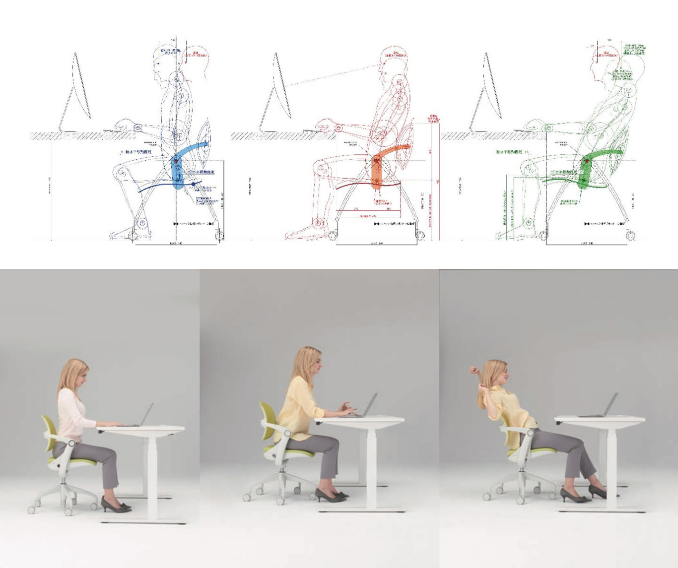 A structure in which the seating position can be freely changed between a forward leaning position for comfortable deskwork, and a more relaxed position. This allows the user to keep their muscles moving comfortably and maintain healthy circulation.