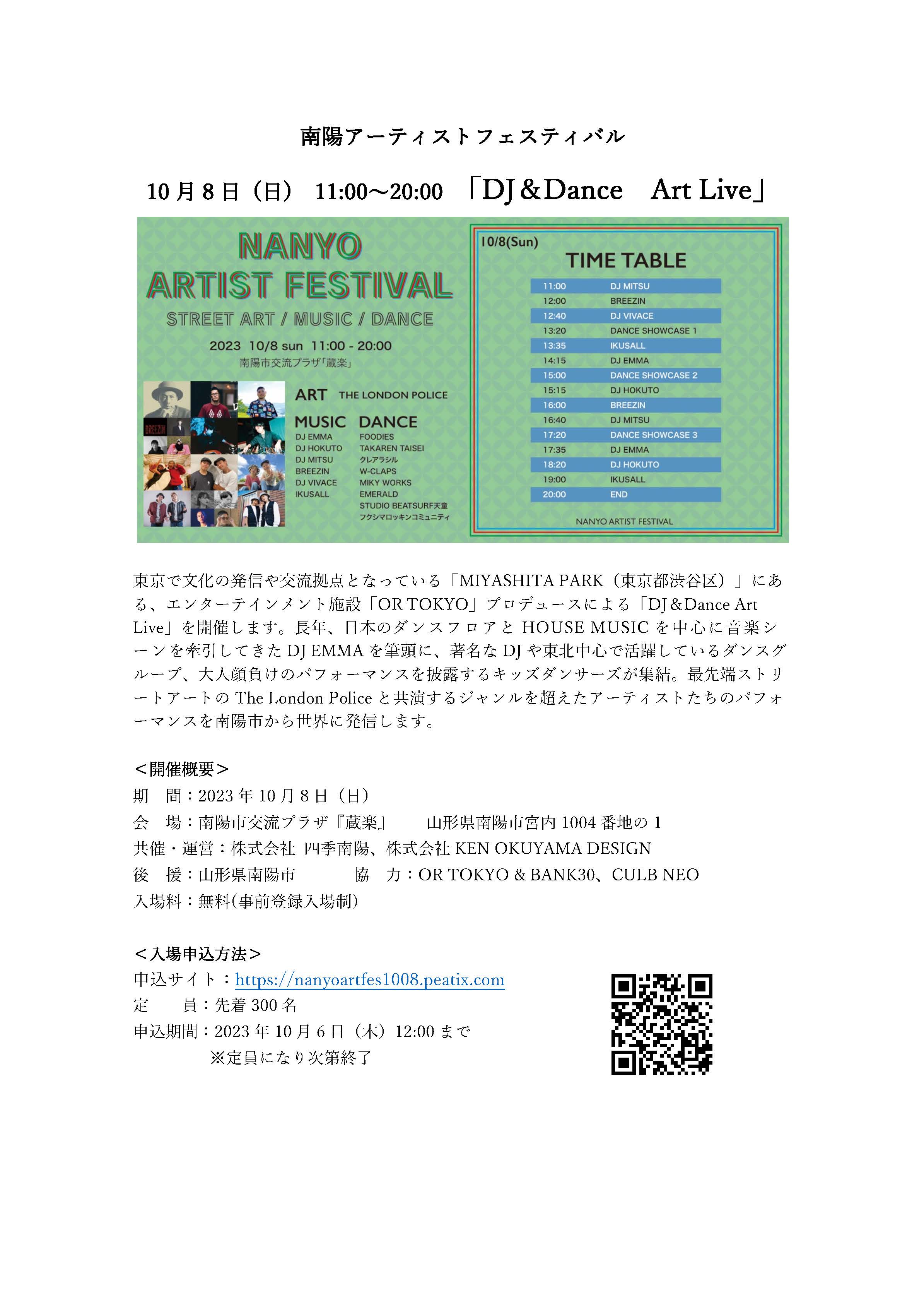 The Art Festival in Nanyo City, Yamagata Prefecture, will host “DJ & Dance ArtLive” produced by the entertainment facility “OR TOKYO” at “MIYASHITA PARK” (Shibuya-ku, Tokyo), which is a center for culture and exchange in Tokyo. Please see PDF for details.