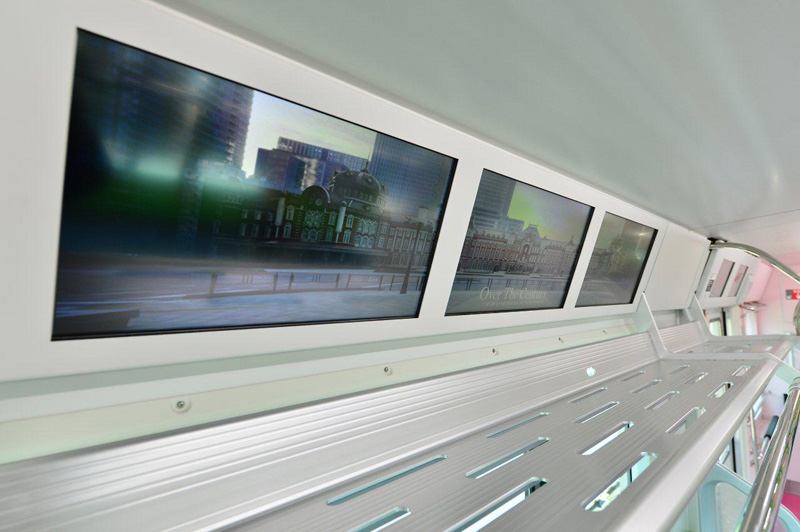 中吊り広告の代わりにデジタルサイネージを設置された内装は、室内を広く見せるばかりではなく、アニメーションやインターネットとの連携など次世代の新しい広告表現を可能にします。