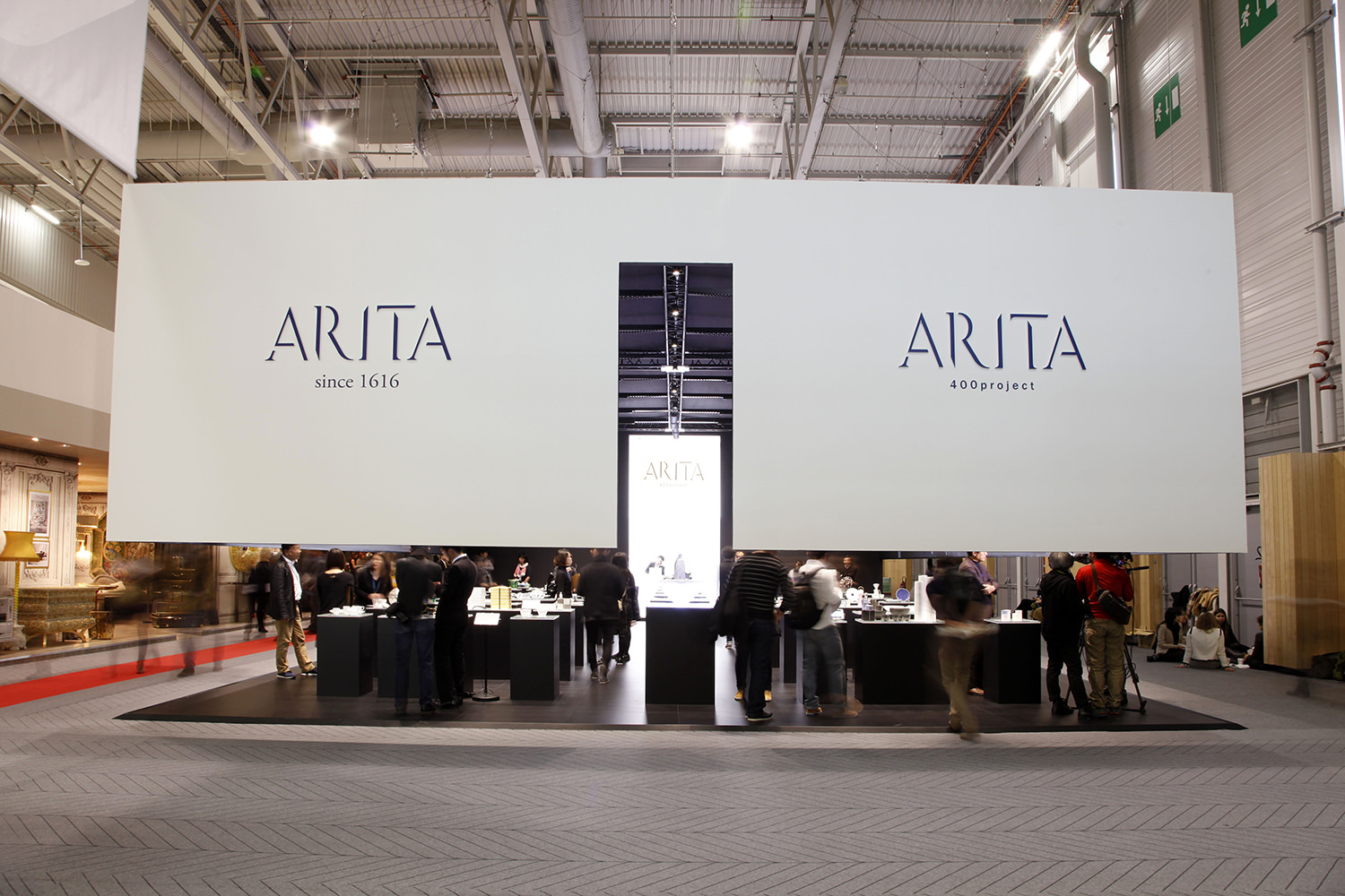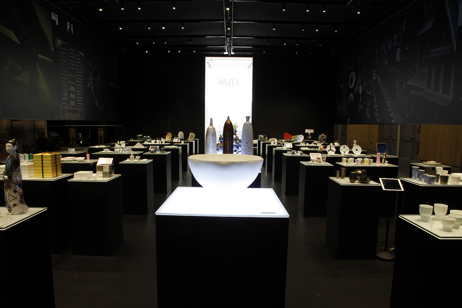有田焼の持つ歴史と技術を参加8社の個性を活かしながら、ARITAという名前を世界にハイブランドとして伝えるため、日本の洗練された美意識とモダンさを感じる世界観で演出を行う。ブースでは宙に浮いた壁のようなブースで、日本の茶室や暖簾などを感じる空間を演出しました。