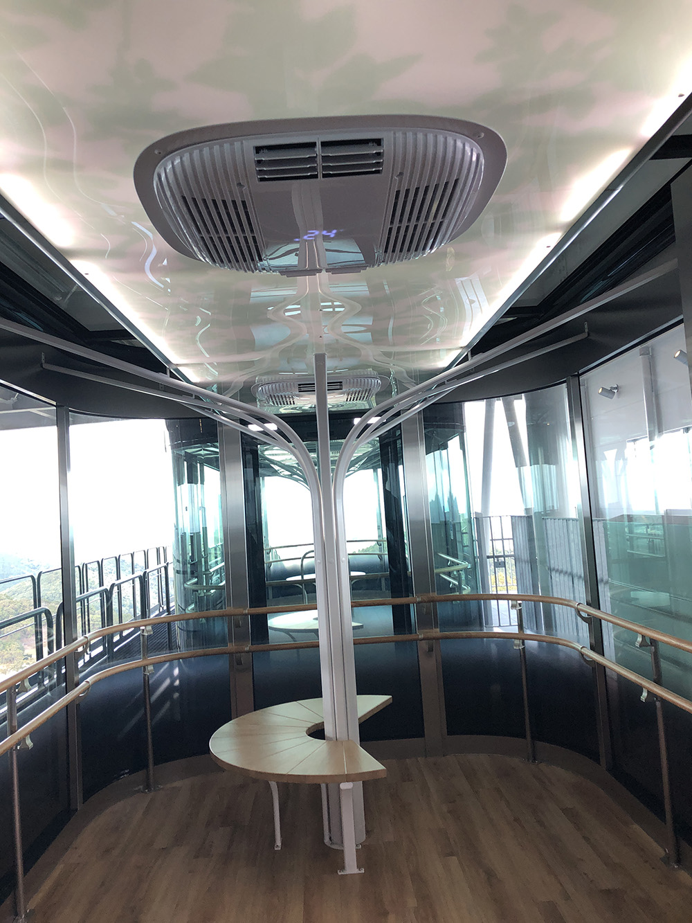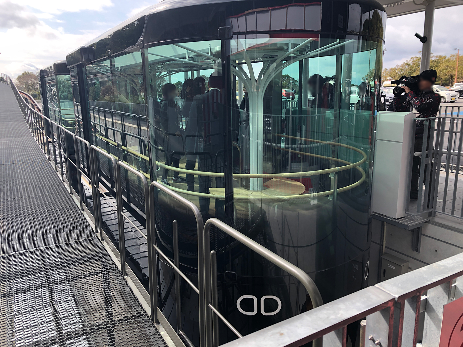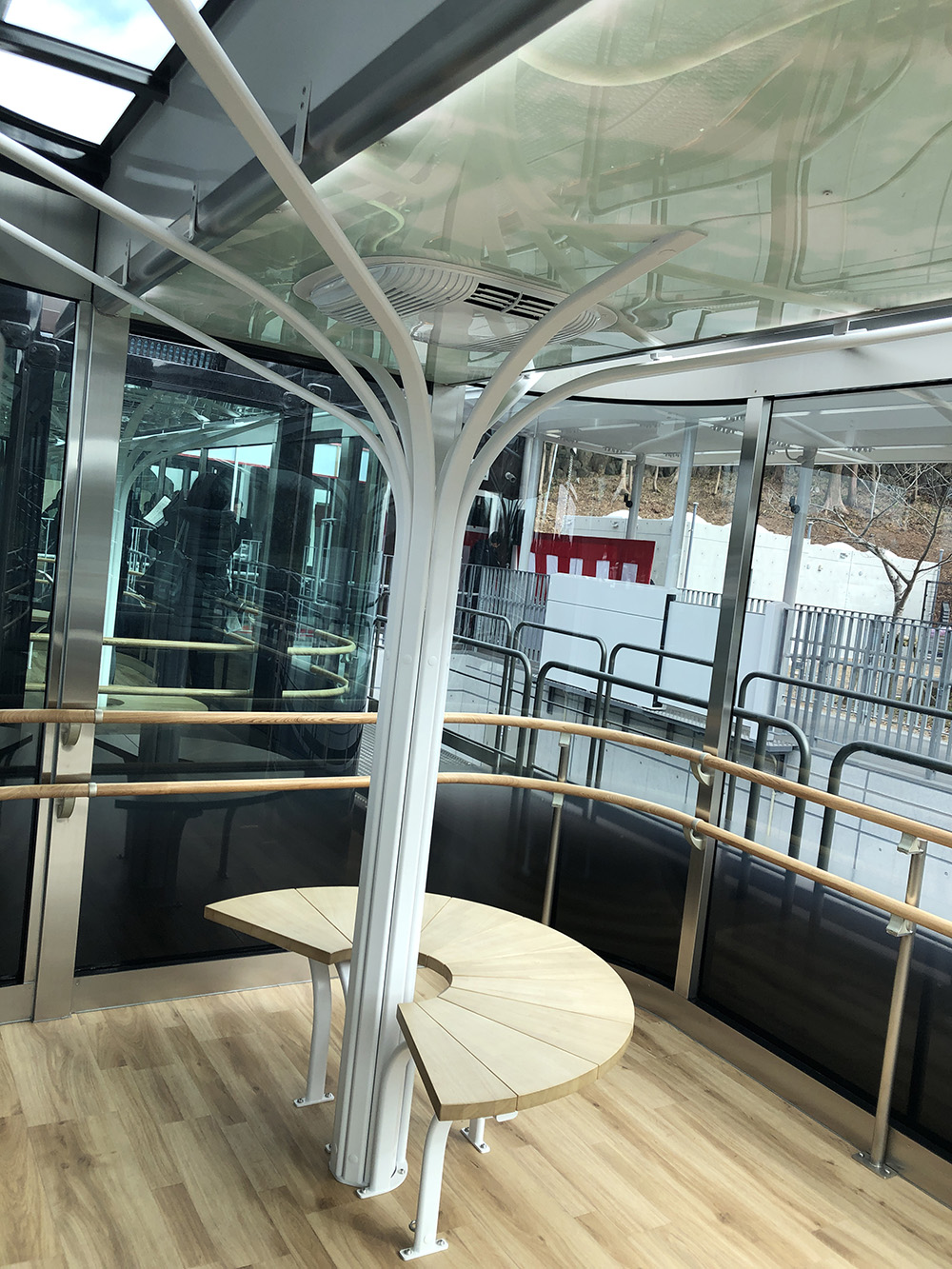 稲佐山の自然を楽しみながら移動できる広いガラス張りと豊かな広葉樹林に溶け込む黒色を特徴にしており、2011年の稲佐山ロープウェイに続く当社のモダンでシンボリックな車両は、2両編成の計80人を乗せて走ります。