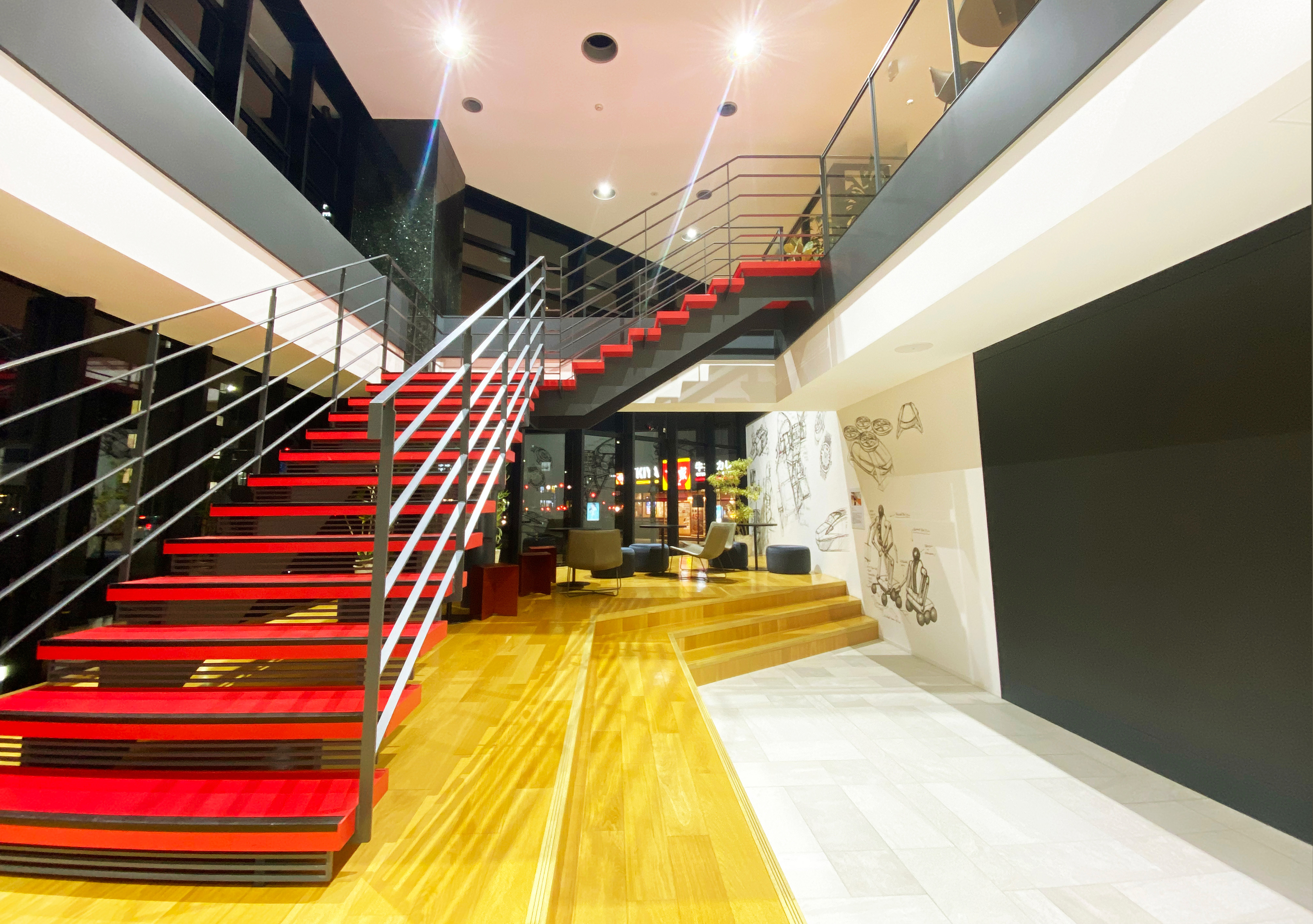 The renovation project of OCA Osaka College Of Desgin And IT Technology has been completed. The facade and the first and second floors have undergone a comprehensive renewal. Stepping into the entrance, visitors are greeted by an open and inviting space, with an iconic red staircase leading to the library lounge as a standout feature. Additionally, an LED screen has been installed, enabling the display of student works and information to captivate passersby.