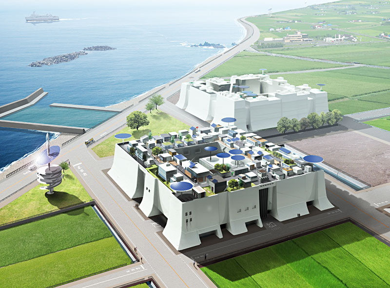 Each city is guarded by 15 meter walls from tsunamis, equipped with public facilities such as marine products processing facilities, hospitals, schools and shopping malls, and houses surround them. It will be the base for those who live and work in the city.