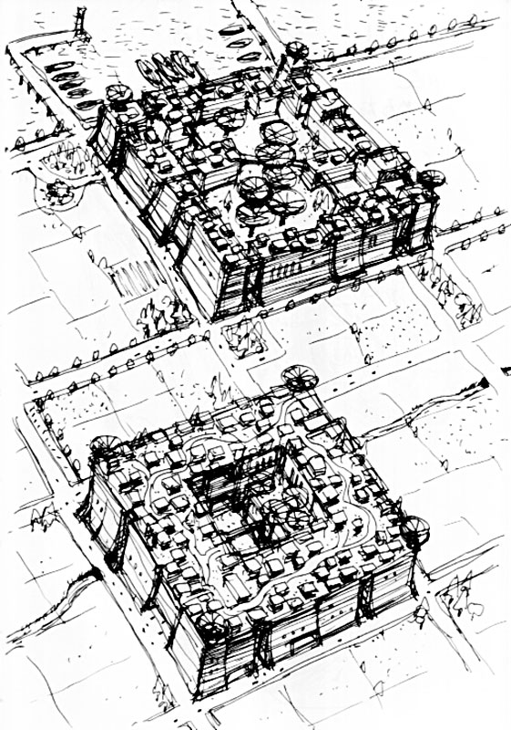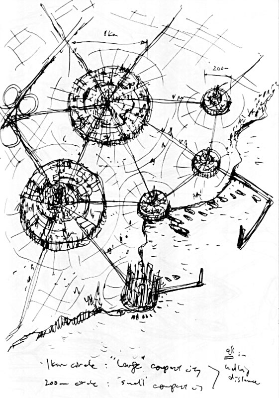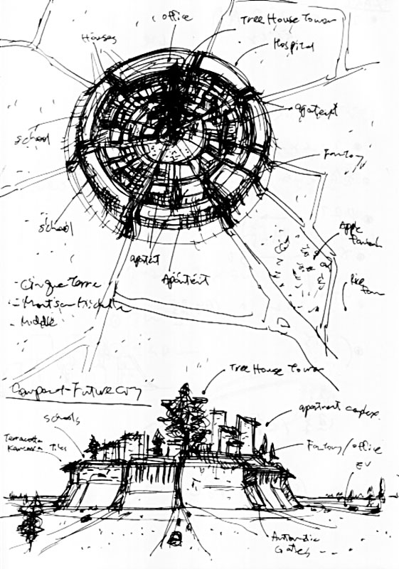 東北の被災地復興を目指してさまざまなクリエーター、建築家とのコラボレーションを行ってきたKEN OKUYAMA DESIGNの考え方を象徴する城壁都市型のスマートコンパクトシティ。そのひとつひとつは、津波から人々を守る高さ15mの城壁上に築かれ、中央に病院や学校などの公共施設や商業施設、周辺には低層の住宅が立ち並び、城壁内部には水産加工工場や漁港などこの地の産業が集約され、ここに暮らす人々の働く場所となります。消費電力と発電量のピークをずらしながら全体のエネルギー収支をコントロールする超スマートシティであり、家庭と職場を近接させ、この地の産業や暮らしぶりが同じ場所に集約された、人が主役のコンパクトシティでもあります。