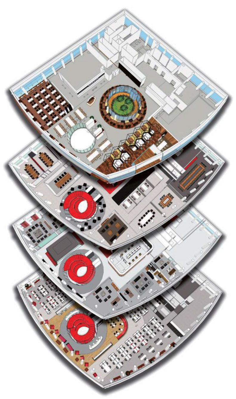 新本社ビルは、2012年の創業100周年を機に新たに策定した、ミッションステートメントの価値観や社会的使命のあり方を、最新のテクノロジーとデザインの力で具現化した、ヤンマーグループの未来の方向性を指し示すコンセプトモデルです。